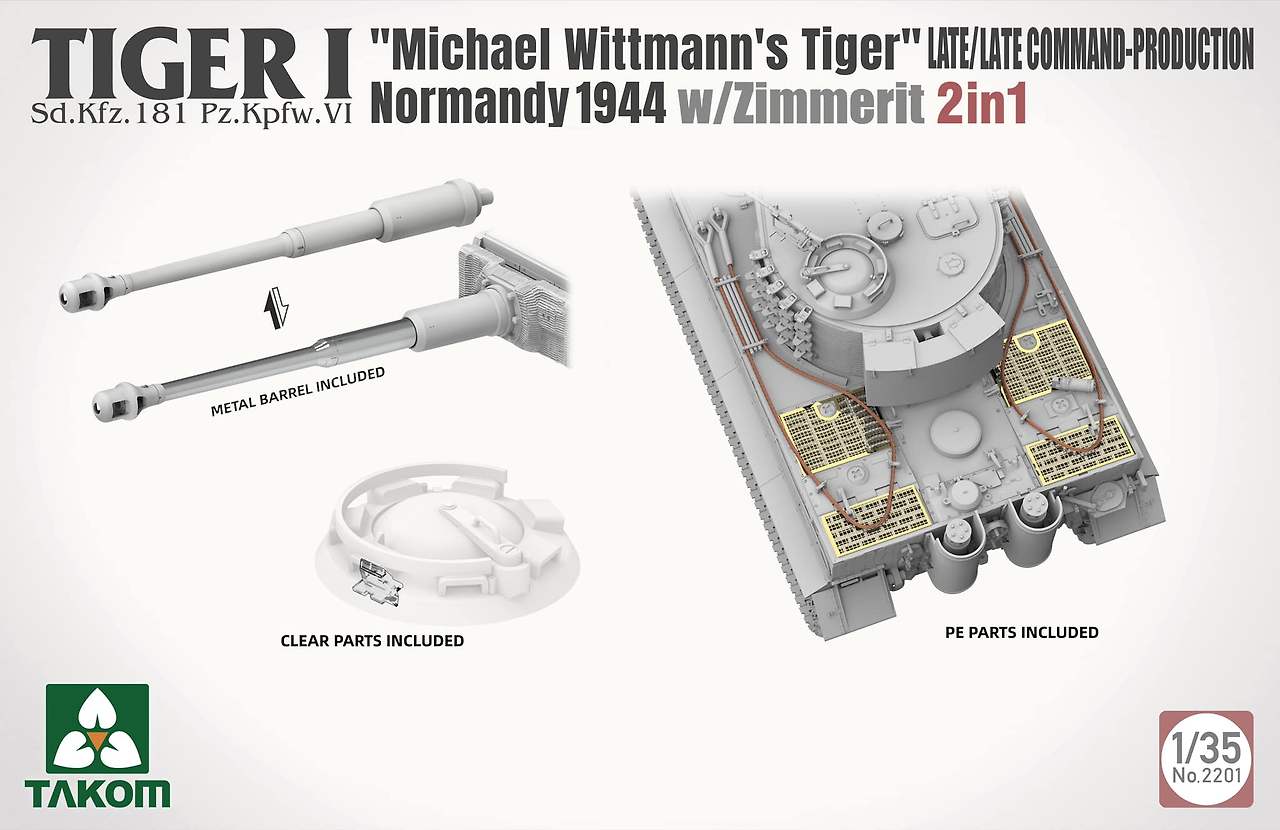 위의 도색도에서 보듯 비트만 최후의 탑승차량이자 sd kfz 268, 즉 지휘형 사양의 007호차와 sd kfz 181 사양의 후기형 티거의 2in1으로 구성되어 있다. 아마도 빌레 보카즈를 염두에 둔 거 같은 231호차, 발타자르 볼이 전차장으로 탑승했던 212호차를 재현하고 있는데 막상 비트만 탑승차랍시고 205호차는 sd kfz 181 사양이 아니라 중대지휘차량일 sd kfz 268 사양이라 고증에서 조금은 아쉽다는 생각이 있다. 뭐 그래도 어차피 들어있는 부품을 조합하면 재현 가능하니 큰 문제는 아니다.