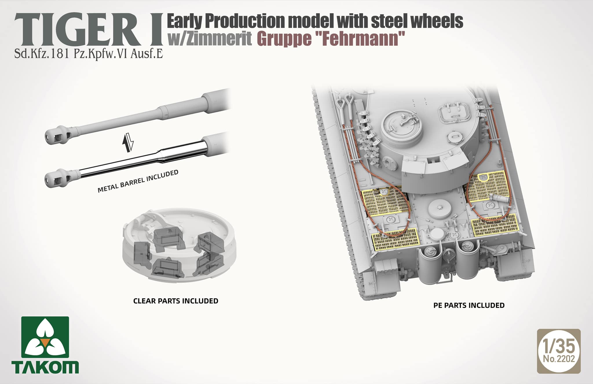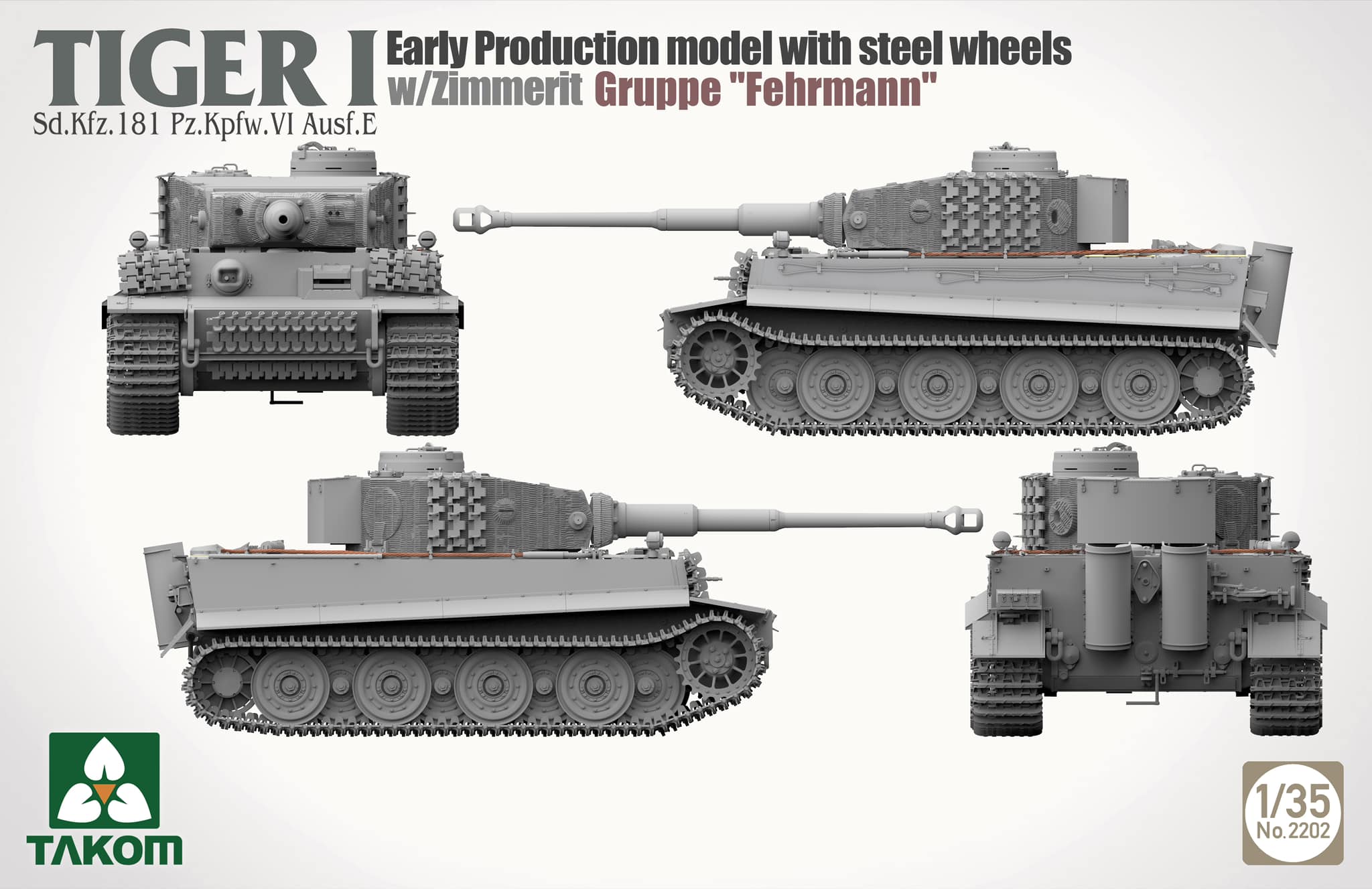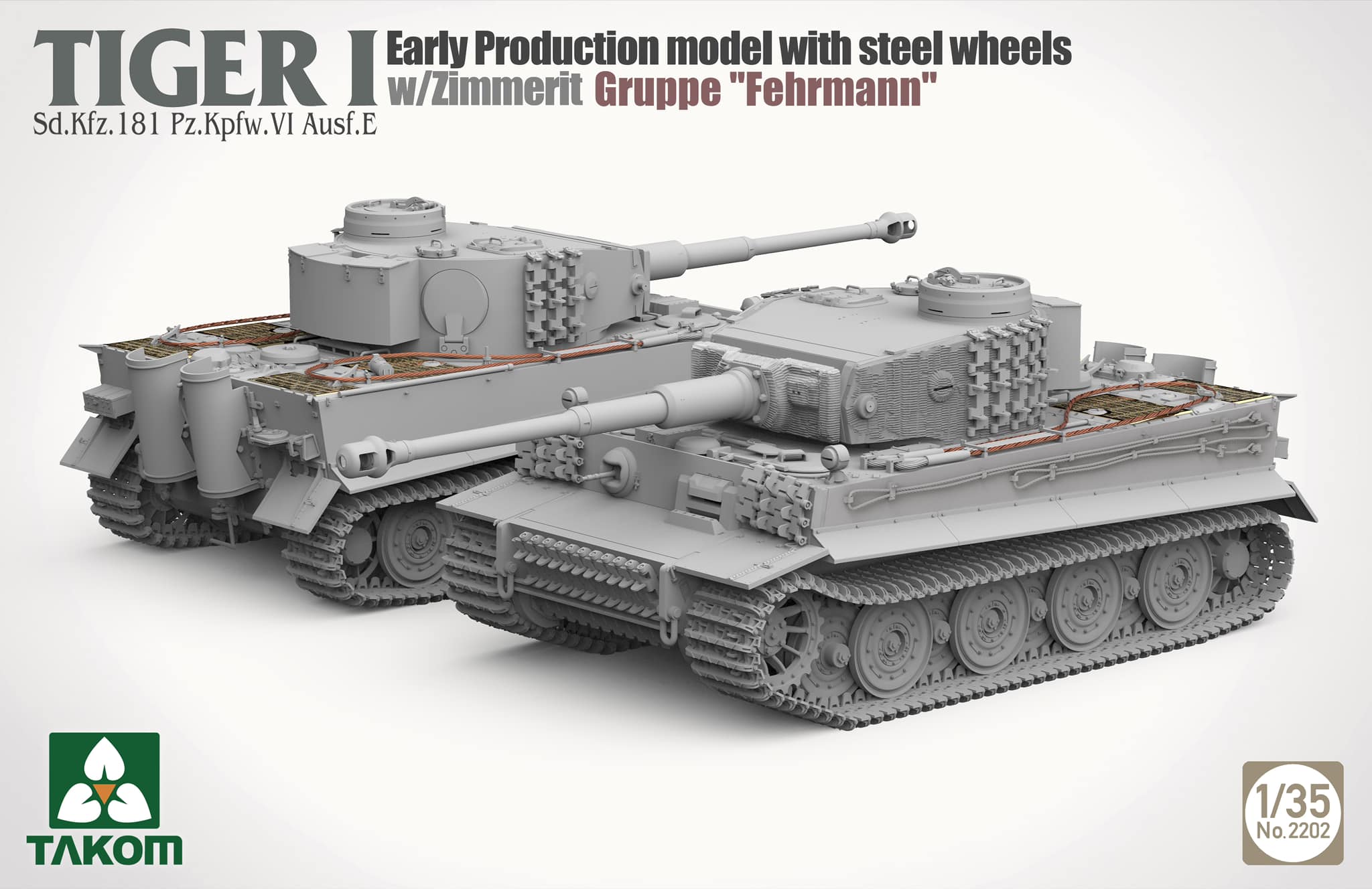 Takom은 kg 페르만 티거의 키트화를 예고했다. 이로서 페르만에 발을 담근 곳은 용가리, 악화, 호밀밭에 이어 네 번째인 셈일까? 다른 페르만 티거들과 달리 둥켈겔프로 밀어버린 만용은 신선하지만 실차들은 3색 위장이라 대체 뭔 근거로 이래놨는지 잘 모르겠다. 슬마 스틸림만 단 초기형이라 생각한 걸까?